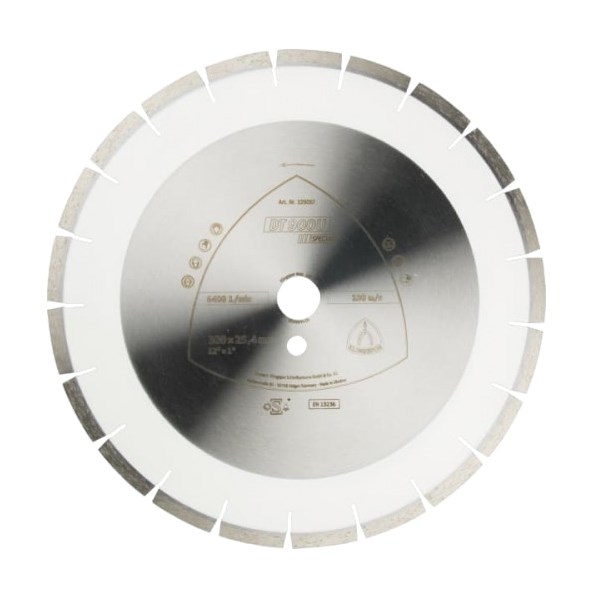 Алмазный диск KLINGSPOR серии DT900U диаметром 350 мм предназначен для обработки бетона (как универсального, так и армированного), гранита, известкового песчаника и других стройматериалов. Эксплуатируется в составе бензорезов и станков со скоростью вращения не более 5500 об/мин и посадкой 30 мм. Сегменты крепятся к сердцевине лазерной сваркой, что гарантирует высокую износостойкость.