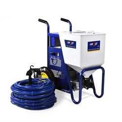 Установка для подачи и нанесения штукатурных растворов на поверхность стен. Используется при декоративных ремонтных работах. Безвоздушное распыление с воздушной поддержкой. Оборудована встроенным компрессором мощностью 1500 Ватт. Для эксплуатации требуется водоснабжение и подключение к электросети с напряжением 220 Вольт. Колесная пара позволяет перемещать оборудование по объекту в процессе работы. Применяется с готовыми штукатурными, текстурными и фактурными смесями. Корпус из высокопрочных материалов защищает внутренние элементы от попадания пыли и грязи. Машина способны выдержать повышенные нагрузки.