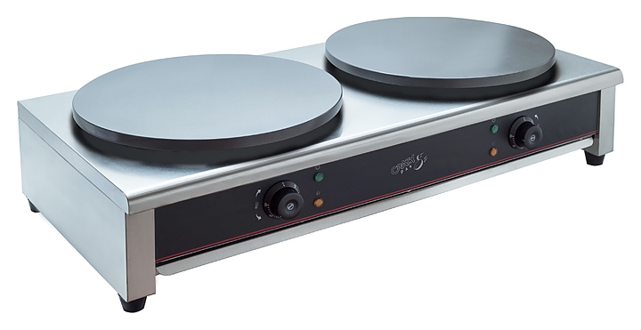 БлинницаCrazy Pan CP-CM400Dиспользуется на предприятиях общественного питания и торговли. Модель оснащена терморегулятором. Модель оснащена 2 Т-образными лопатками, 2 ТЭНамии поддоном. Корпус выполнен из нержавеющей стали, жарочныхповерхности - из чугуна с антипригарным покрытием.