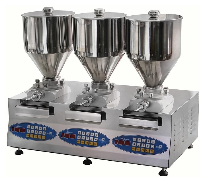 Дозатор начинки ICB tecnologie s.r.l.12 DOSI3Cиспользуется в пекарнях и кондитерских, на предприятиях пищевой промышленности и общественного питания для наполнения кремом пирожных, круассанов, эклеров, трубочек, профитролей. Модель оснащена тремя шестеренчатыми бункерами и цифровымипанелямиуправления, на которыхможно настраивать оптимальное количество отсаживаемого крема, время дозирования и наполнения, интервал паузы и другие характеристики. Каркас и воронкивыполненыиз нержавеющей стали.
