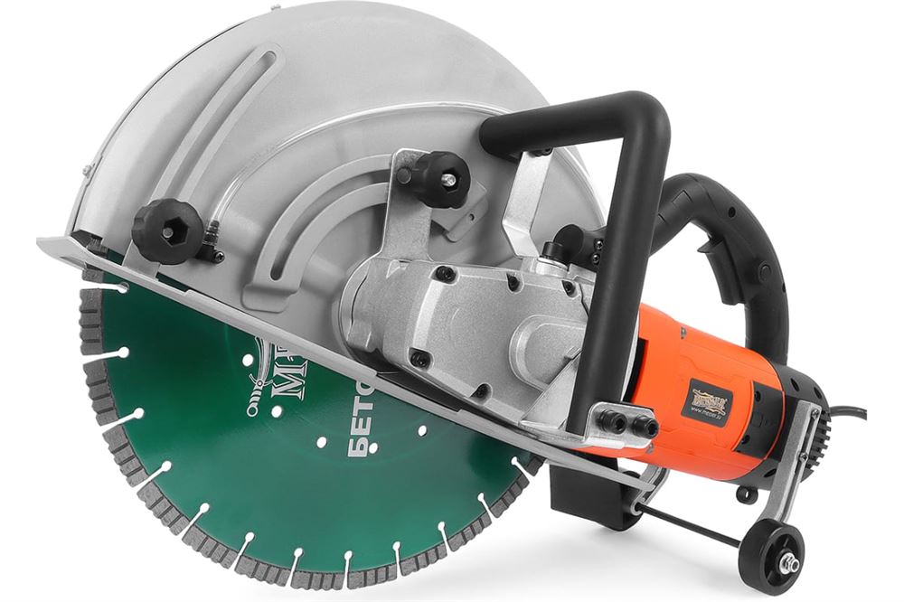 Оснащен электрическим двигателем мощностью 3500 Вт. Имеет плавный пуск и защита от перегрузки. Работает от стандартной сети 220 В. В зону резки подается вода, что снижает пылеобразование и износ диска.