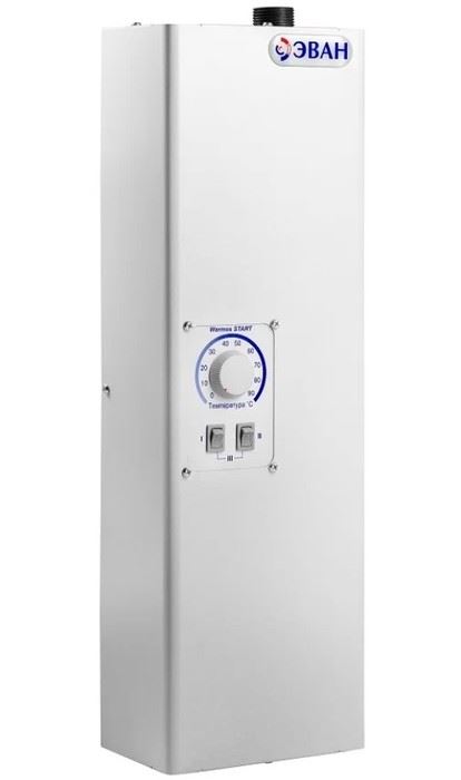 Электрические котлы от российской компании ЭВАН серии Warmos Start 2023 представлены моделями с мощностью от 3 до 14 кВт. Оборудование отличается компактными размерами, продуманной конструкцией и высокой энергоэффективностью. Приборы предназначены для настенного монтажа и оснащены механическим управлением.