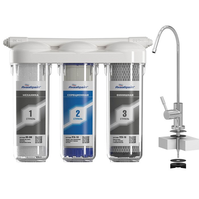 Компания Аквабрай известнейший отечественный производитель фильтрующих систем для воды. Серия АБФ-ТРИА представлена 3 фильтрующими системами - стандарт, умягчение и антижелезо. Производительность фильтром составляет - 3 литра в минуту. Устанавливаются данные комплекты под раковину и оснащены краном.