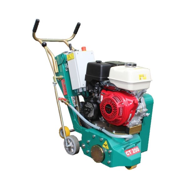 Фрезеровальная машина CT 250-PA оснащена бензиновым двигателем, генератором и приводом. Подходит для использования в удаленных от электричества зонах. Правильно сбалансированный вес позволяет увеличить давление на поверхность и избежать подпрыгивающего эффекта. Подшипниковые узлы с самоцентровкой, на которых закреплен вал, уменьшают ударные нагрузки и способствуют снижению вибраций. Равномерность и быстрота фрезерования достигается благодаря смещенному вниз центру тяжести. Применяется для снятия дорожной разметки, старых покрытий и краски.