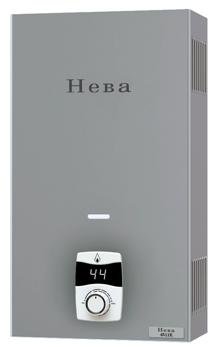 NEVA (Нева) 4511Е, алюминий - газовый проточный нагреватель для установки на стену. Не требует подключение к электросети, горелка включается автоматически и питается от батареек. Устройство легко установить, а наличие дисплея значительно упрощает эксплуатацию, т.к. он показывает ошибки в случае их возникновения. Максимальная производительность КПД - 87%.