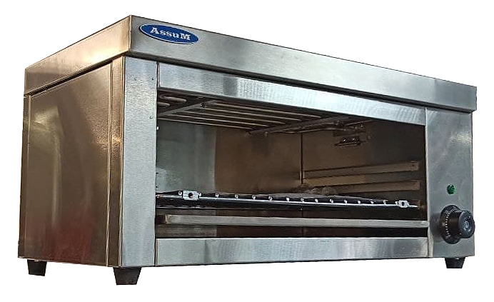 Гриль SalamanderAssum TT-WE113B предназначен дляобжаривания стейков и сосисок, приготовления и подогрева сэндвичей, гамбургеров ихот-догов на предприятиях общественного питания и торговли. Модель оснащена нагревательным элементом, расположенным сверху, регулятором мощности, индикатором нагрева и поддоном для масла.Корпус выполнен изнержавеющей стали.