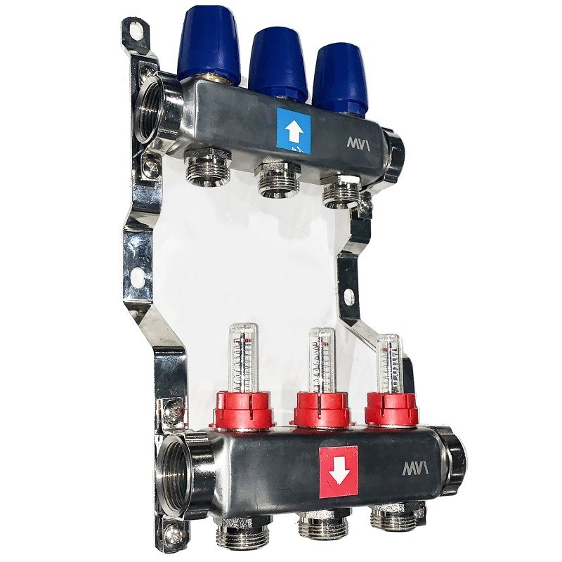 Коллекторные блоки MVI предназначены для распределения потока рабочей среды систем водяного отопления по потребителям. При этом под «потребителем» понимается отдельный нагревательный прибор или группа приборов, контур или петля «теплого пола», отдельные части или ветви системы. Коллекторный блок объединяет в себе подающий и обратный коллекторы из нержавеющей стали, ручные настроечные клапаны c расходомерами, термостатические клапаны с возможностью установки электротермического сервопривода и крепежные кронштейны. Коллекторные блоки могут работать как на водяном, так и низкозамерзающем гликолевом теплоносителе. Коллекторные блоки выпускаются с количеством выходов от 2 до 12. Присоединение циркуляционных петель осуществляется с помощью фитингов стандарта «евроконус» 3/4 НР.