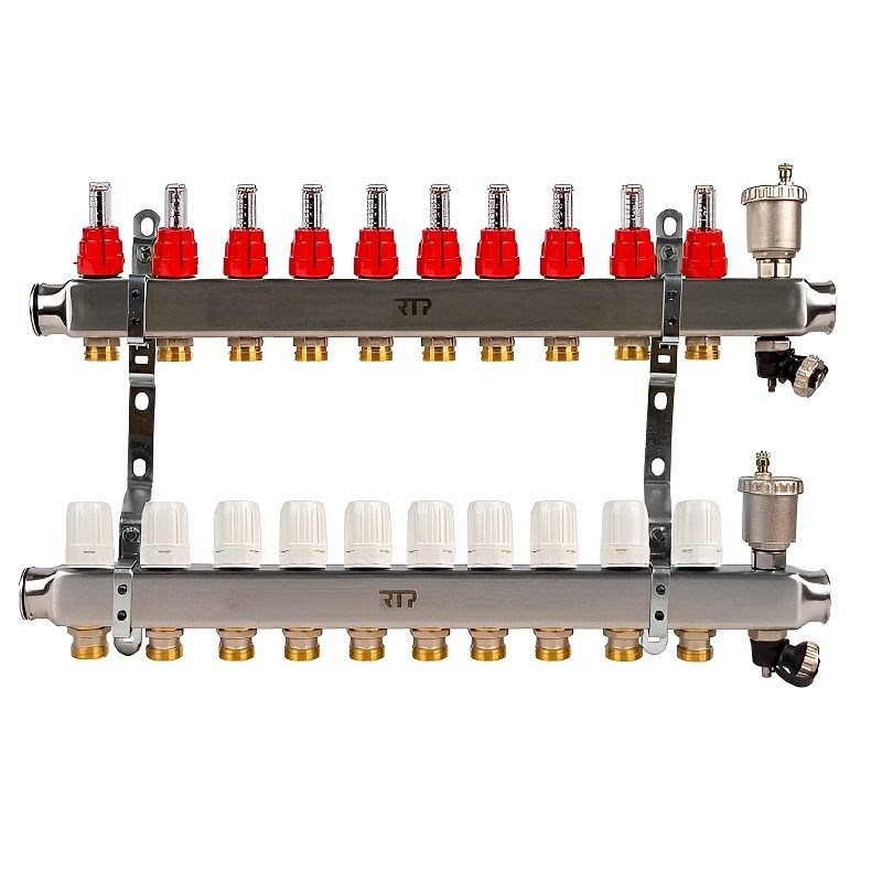 Коллектор RTP 1 х3/4 , 10вых., c вентилями, с расходомерами, сталь нерж., белый, в сборе