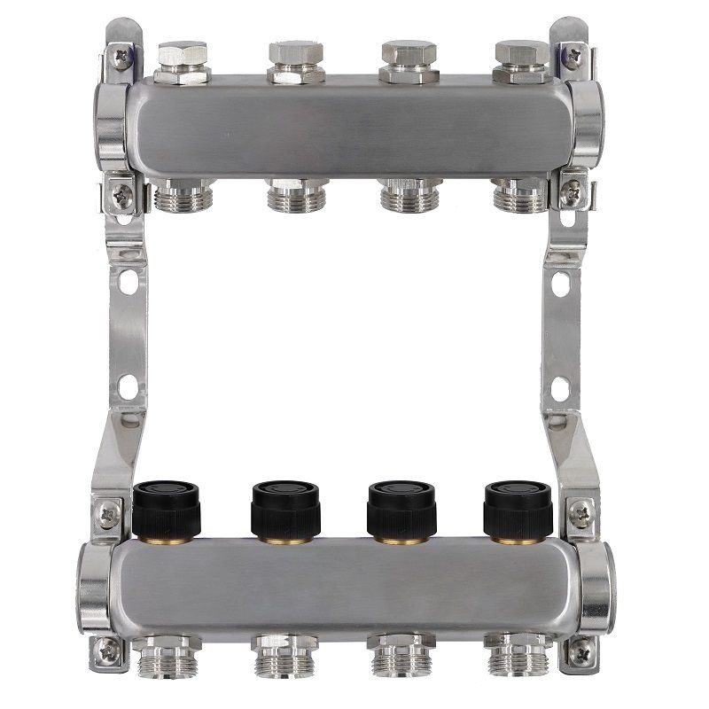 Коллекторный блок из нержавеющей стали служит для распределения потоков по контурам теплого пола, радиаторного отопления, прочих климатических систем, где в качестве теплоносителя используется вода либо незамерзающие растворы гликоля с максимальной рабочей температурой 90 °С, рабочим давлением до 9 бар.