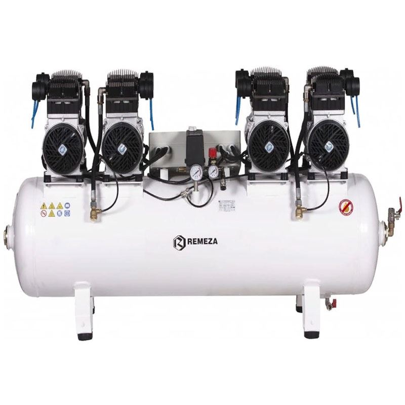 Поршневой нагнетатель воздуха Remeza СБ4/С-150.OLD20x4 безмаслянный используется для работы на промышленном производстве с пневоинструментами и промоборудованием, где нужна подача сжатого воздушного потока без примесей. На устройстве поставлен коаксиальный привод, восемь цилиндров и четыре мотора мощностью в 1,4 кВт каждый.