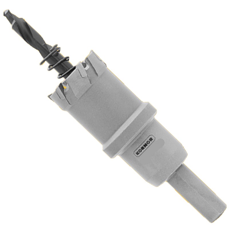 Корончатое сверло KORNOR TCT Drill для эксплуатации на сверлильной технике. Диаметр - 26 мм. Изделие предназначено для стабильного сверления черного металла, алюминия, пластика, графита и другого материала. Используется при ремонте, строительстве, на производстве и в быту. Предусмотрена твердосплавная карбид-вольфрамовая режущая часть длиной 10 мм. Утроенная грань лезвия обеспечивает плавны и быстрый рез с пониженными вибрациями. Удобный 3-хгранный хвостовик рассчитан на крепление на кулачковых патронах любого вида. Комплектация включает выталкивающую пружину и центрирующее сверло.