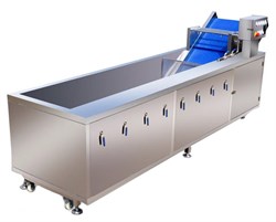Овощемоечная машина RoalVeget X200Mиспользуется на предприятиях общественного питания, а также в производственных цехах, деятельность которых связана с выпуском гастрономических товаров для мытьядля листовых овощей и трав, фруктов и корнеплодов. Принцип работы основан нанепрерывной и регулируемой подаче воды под высоким давлением с пузырьками воздуха, с последующем ополаскиванием и десульфацией спреем над конвейерной лентой.