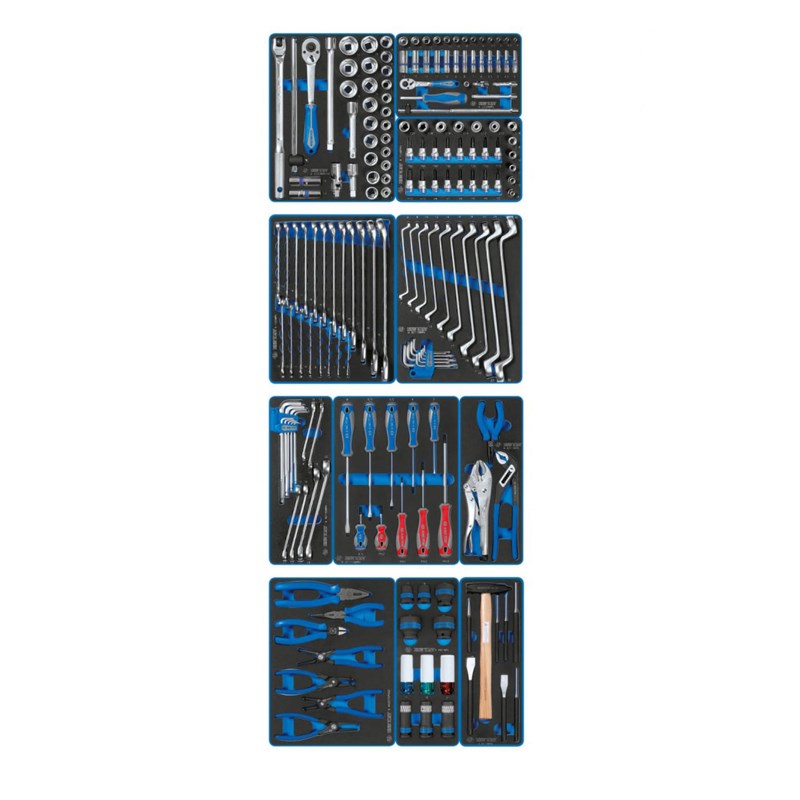 Все инструменты изготовлены из высокопрочной стали с добавлением хрома и ванадия особой закалки. Общее количество – 188. Массивные колеса оснащены тормозом, способны выдержать до 450 кг нагрузки. Корпус тележки имеет защитное порошковое покрытие и верхнюю панель их полимера. Сбоку расположен главный замок.
