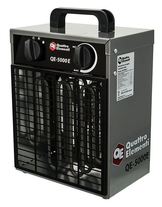 Нагреватель воздуха QUATTRO ELEMENTI (Четыре Элемента) QE-5000 E электрический прямого нагрева, быстро обогревает помещение. Корпус этой модели изготовлен из стального листа. Блок управления расположен на корпусе тепловой пушки. Воздух нагревается спиральным нагревательным элементом из нержавеющей стали. Он не сжигает кислород и не сушит воздух, поэтому его можно использовать для обогрева жилых комнат, офисов, мастерских, магазинов.