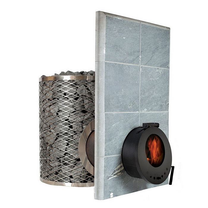 IKI (Ики) KIVI-IKI-SL со стеклянной дверцей (сквозь стену, дверца открывается направо) это дровяная печь, которая имеет высокую эффективность по теплоотдаче благодаря дымоходной трубе, закрученной петлей под камнями. Модель выполнена из современных, жаропрочных материалов и с применением высокоточной сварки.