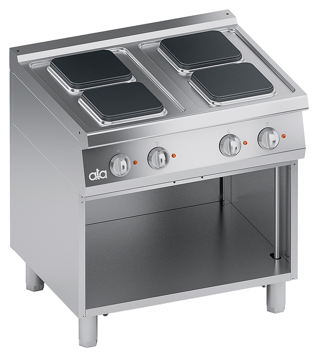 Электрическая плитаАТАELECTRIC RANGE 4 PLATES + OPEN CABINETпредназначена для приготовления блюд в наплитной посуде на предприятиях общественного питания и торговли. Модель оснащена температурными датчиками внутри конфорок, обеспечивающими безопасность работы и регулируемыми по высоте ножками.Корпус и ножки выполнены из нержавеющей стали, рабочая поверхность и передняя панель - из нержавевеющей сталиAISI 304, атермические ручки - из пластика с трафаретной печатью по краям, квадратные конфорки - из чугуна.