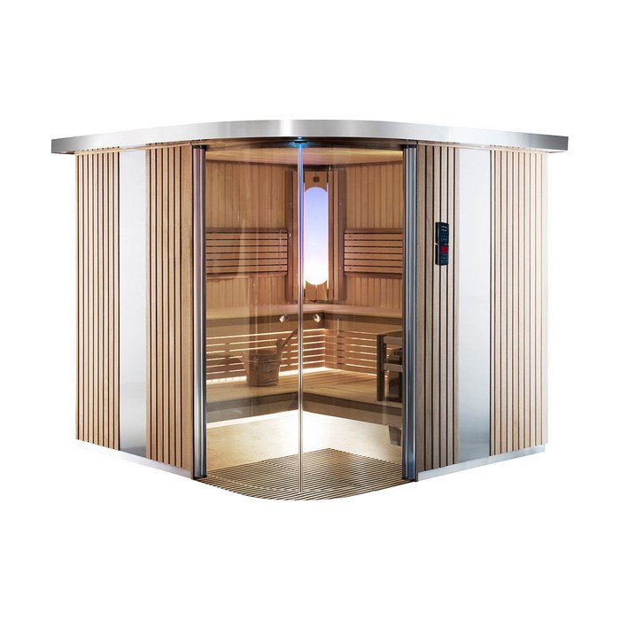 Сауны RONDIUM это новая разработка специалистов компании HARVIA для изысканного вкуса с внедрением элементов роскошного декора. Структура сауны выстроена в сочетании металла и дерева и конечно же привлекательные для практического использования элементы. Помимо декоративных компонентов присутствует светодиодная подсветка, а внутри классическое оформление сауны из дерева.