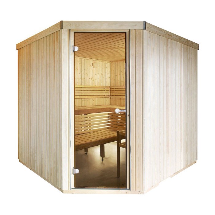 Сауна HARVIA (Харвиа) Variant интерьер Formula 1945 x 1505 S2015L имеет угловое исполнение с дверями, что открываются в левую сторону, при учете чего она устанавливается в нужном месте. Кроме удобства скамейки для присутствующих могут снабжаться подсветкой. Интерьер сауны имеет привлекательную текстуру укладки деревянных досок из качественной липы.