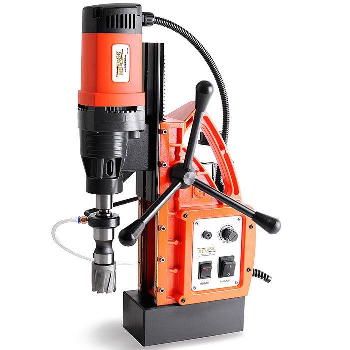Самый мощный сверлильный станок по металлу серии MDM, с максимальным диаметром сверления 60 мм (при работе кольцевыми сверлами типа ТСТ и HSS). Сила магнитного крепления эквивалентна 16 000 кгс. Количество оборотов плавно (бесступенчато) регулируется, скорость работы без нагрузки может варьироваться в диапазоне 100-430 оборотов в минуту. Надёжный электрический двигатель с напряжением 220В и мощностью 1,89 кВт гарантирует долгую бесперебойную работу. Стандартный шпиндель с креплением Конус Морзе, в комплекте поставляется адаптер для хвостовика Weldon-19. Эргономичный современный дизайн, вес станка 24 кг.