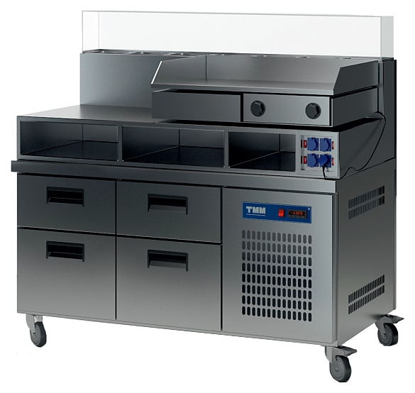 Модульная станцияТММ СХСБ-СМ-1/4Яиспользуется на предприятиях общественного питания и торговлидля обработки ингредиентов для приготовления бургеров и кратковременного хранения готовой продукции. Надстройка обеспечивает легкий доступ к используемым компонентам. Модель оснащена 3-сторонним закаленным стеклом. Цельнозаливной корпус и фасад выполнены из нержавеющей стали.