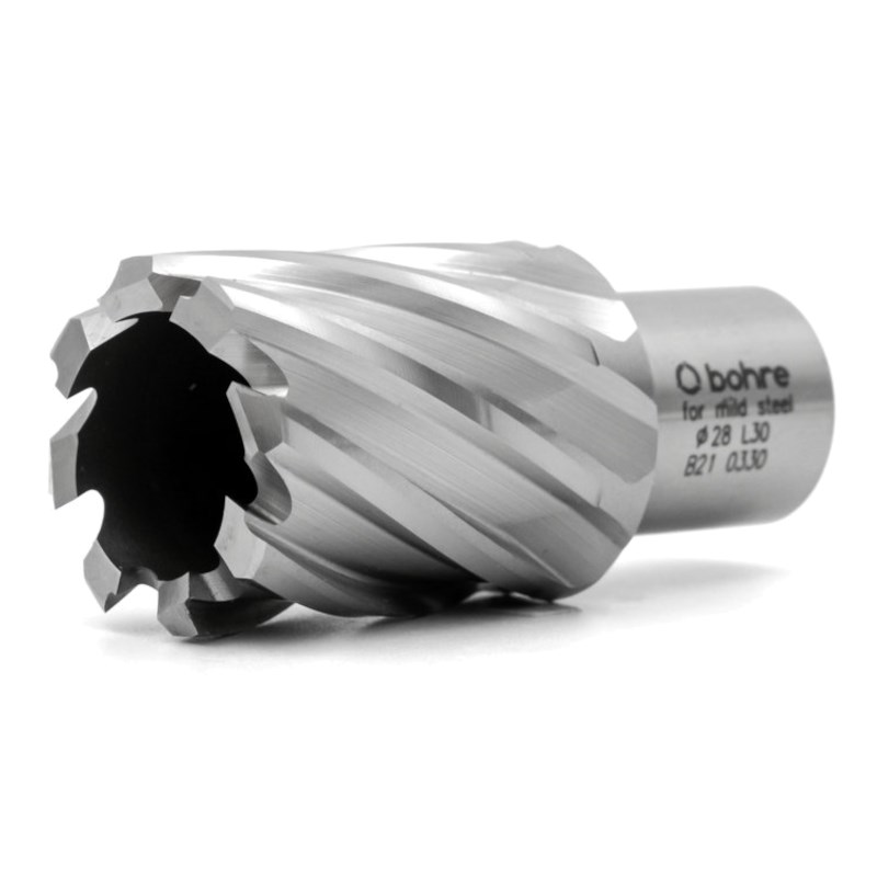 Bohre диаметром 28 мм — кольцевая фреза длиной 30 мм. Для изготовления применяется быстрорежущая сталь HSS, позволяющая при необходимости затачивать инструмент. Использование сверла гарантирует высокую производительность — до сантиметра в минуту. Оснащается посадочным размером Велдон, который используется с большим количеством магнитно-сверлильных станков. Возможные материалы обработки: цветные металлы, сталь конструкционная и нержавеющая.
