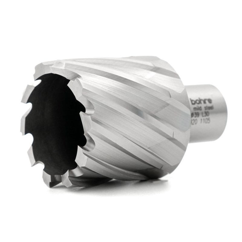 Bohre 39 мм — короткая кольцевая фреза длиной 30 мм. Для изготовления применяется сталь быстрорежущая типа HSS, которую можно затачивать до 10 раз. Производительность работы достигает до 10 мм/мин. Посадка Weldon подходит для большинства магнитно-сверлильных станков. Для увеличения срока эксплуатации рекомендуем работать с СОЖ.