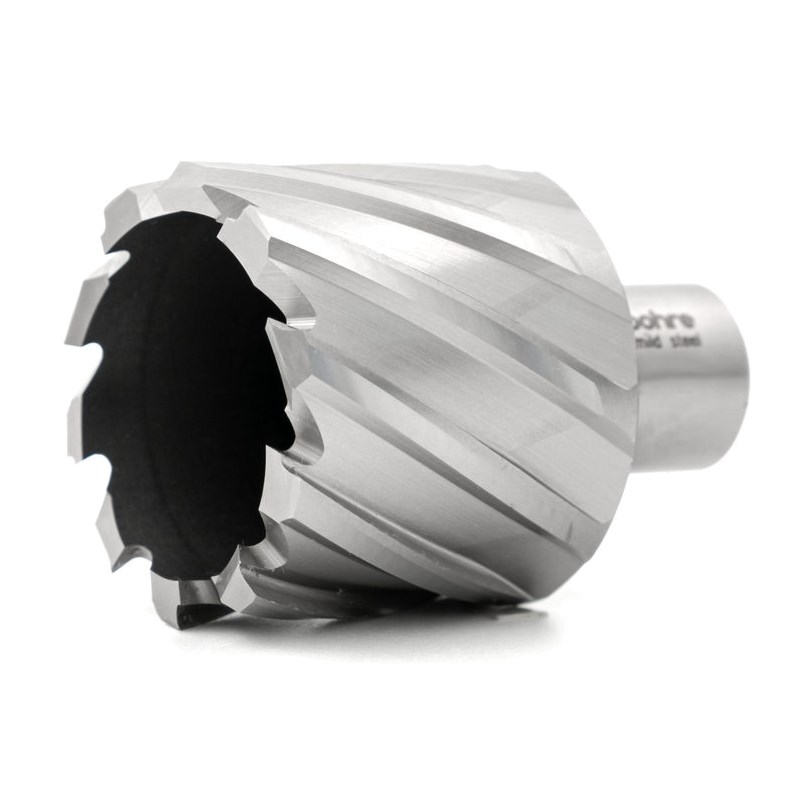 Bohre 45 мм — короткая кольцевая фреза длиной 30 мм. Для изготовления применяется сталь быстрорежущая типа HSS, поддающаяся многократной заточке. Производительность работы составляет до сантиметра в минуту. Посадка Weldon подходит для большинства сверлильных станков по металлу. Для увеличения срока службы советуем работать с СОЖ.