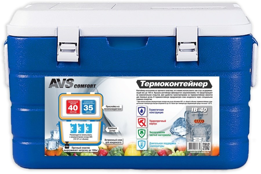 Термоконтейнер AVS (АВС) IB-40 имеет вместимость 40 литров и долгое время сохраняет продукты холодными и свежими. Корпус контейнера изготавливается из прочно пластика и может использоваться в качестве стула, так как выдерживает вес до 100 кг. Крышка контейнера плотно фиксируется с помощью специальных защелок, а для транспортировки предусмотрены две удобные боковые ручки.