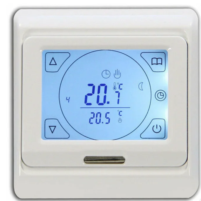 Универсальный терморегулятор Miro (Миро) RTC 91.176 оснащен датчиком, который регулирует температуру теплого пола и воздуха в комнате. Прибор с сенсорным управлением можно программировать. Подходит для управления электрическим теплым полом, а также для инфракрасного отопления. На информативный жидкокристаллический дисплей с синей подсветкой выводится необходимая информация.