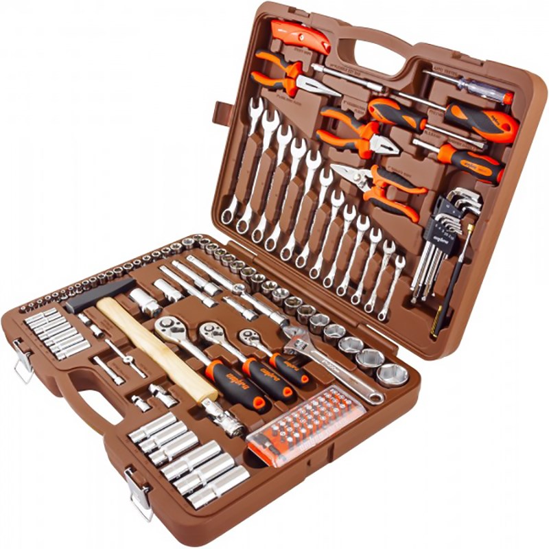 Комплектация: в комплекте торцевые головки, удлинители, шарниры, рукоятки, переходники, вороток, набор бит, разводной, комбинированные и торцевые ключи, отвертки, магнитная ручка, пассатижи и другие аксессуары. Посадочное соединение изделий - 0,5, 1/4 и 3/8 дюйма.